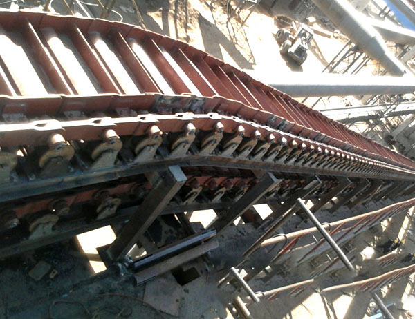 鏈板式輸送機鏈板部分由牽引鏈和槽板組成。牽引鏈采用耐沖擊、運行平穩可靠的片式牽引鏈,內鏈片中間裝有滾輪,在軌道上滾動,以減少摩擦阻力和磨損。槽板用螺栓與牽引鏈緊固在一起。