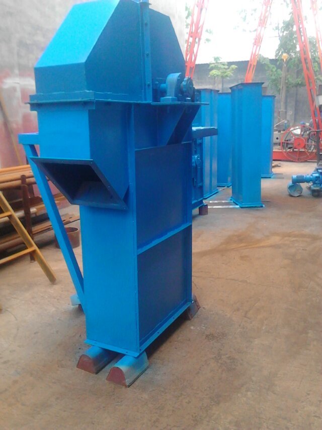 料斗把物料從下面的儲藏中舀起,隨著輸送帶或鏈提升到頂部,繞過頂輪后向下翻轉, 斗式提升機將物料傾入接受槽內。帶傳動的斗式提升機的傳動帶一般采用橡膠帶,裝在下或上面的傳動滾筒和上下面的改向滾筒上。鏈傳動的斗式提升機一般裝有兩條平行的傳動鏈,上或下面有一對傳動鏈輪,下或上面是一對改向鏈輪。斗式提升機一般都裝有機殼,以防止斗式提升機中粉塵飛揚。